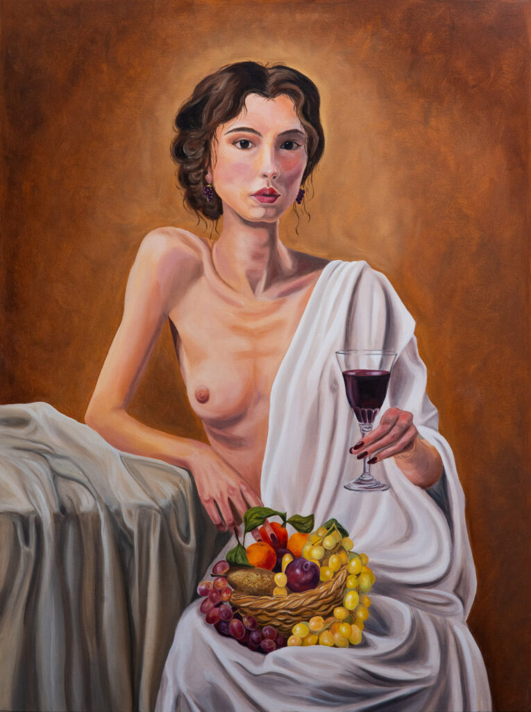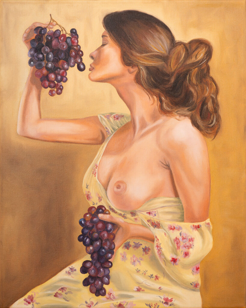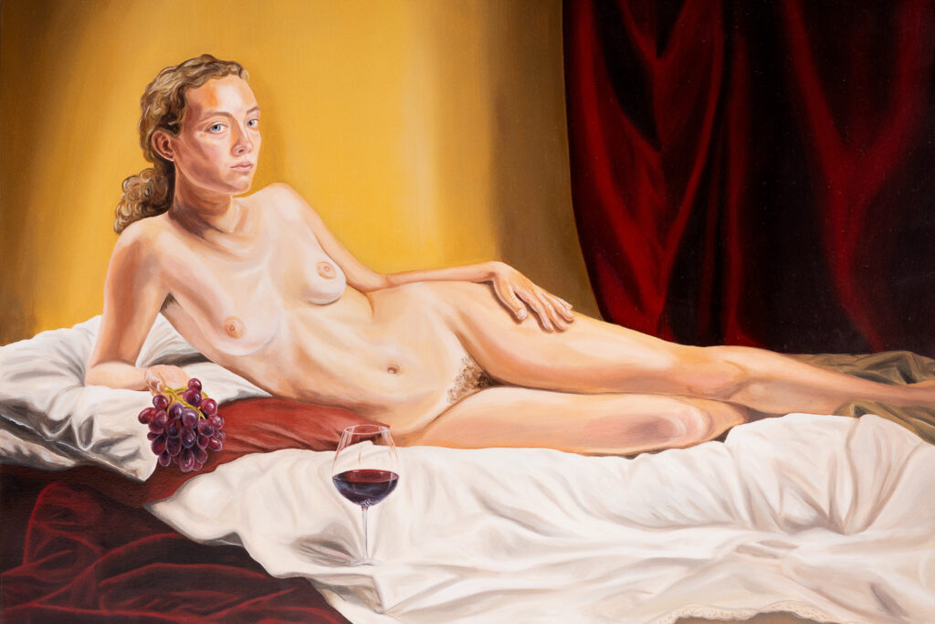 A harmonious encounter on canvas between the elegance of the female nude and the allure of the world of wine. All artworks featuring women and wine are one of one, unique pieces, painted in oil.